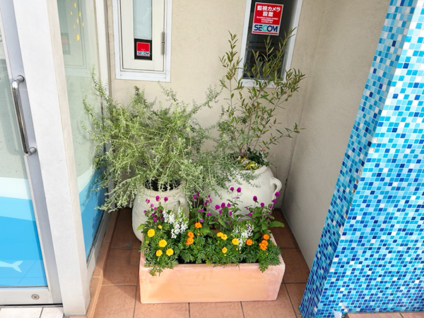 病院へ来られる方はもちろんの事、バスを待たれる方々の憩いの場所になればいいなという思いと、病院の外装が海を模していることから、地中海風のテラコッタプランターを使い、爽やかな風が吹いてくるような・・・そのようなイメージで仕上げました。