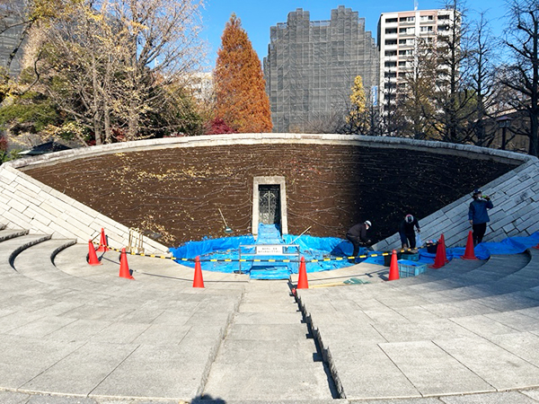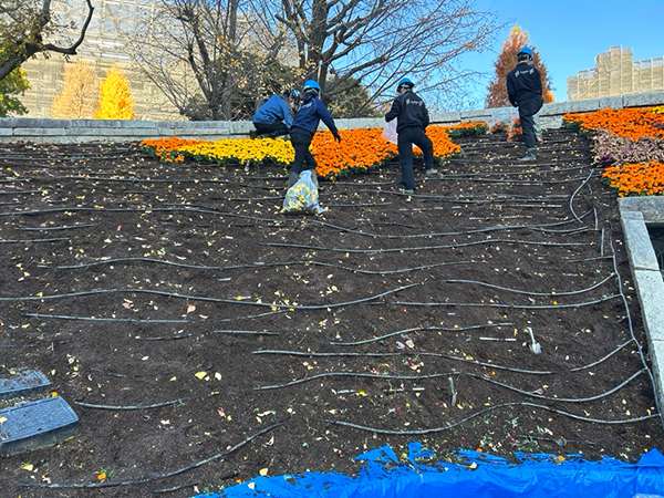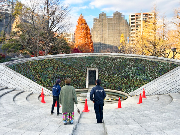 年4回、こうして都内在学の学生さんが描いた絵をベースに、平和と鎮魂を願った花壇管理をしています。