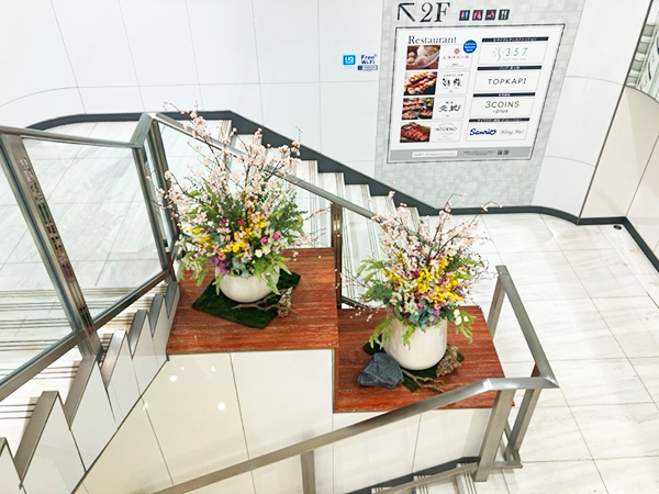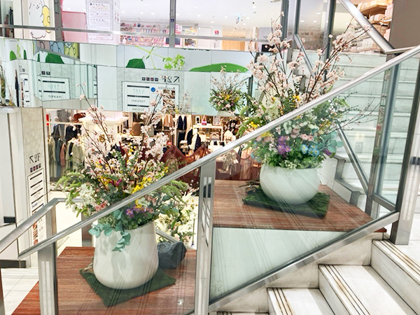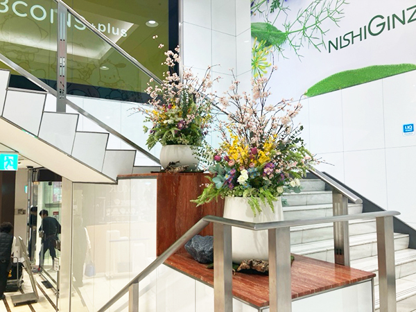 銀座にあります西銀座デパート様の1F階段踊り場に春装飾をさせて頂きました。