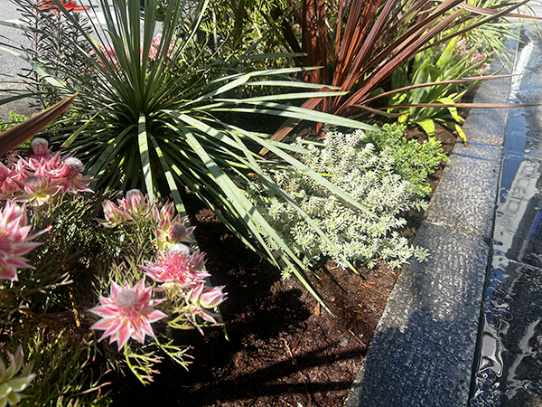 プランニングからさせて頂きまして、夏の酷暑にも負けにくいユッカ等オージープランツを植えさせて頂きました。グレビレア等お花が咲くものも織り交ぜております。
