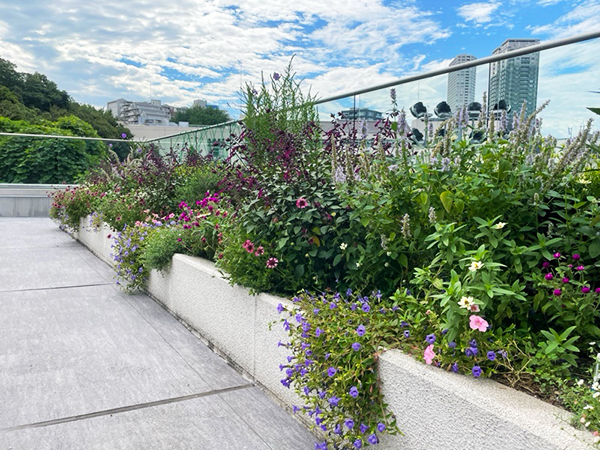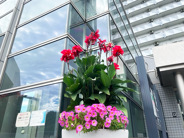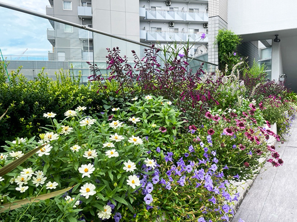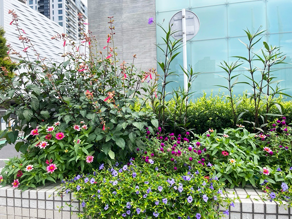 弊社では港区の高輪みどりでつながるプロジェクトの運営支援をしております。プロジェクトメンバーの皆様と地道に花壇の水やり、管理を続けて無事に夏を越すことができました。底面給水プランターで栽培しているペチュニア・ビューティカルとカンナ・カノーバは夏中花を咲かせ続ける優秀な品種でした。9月末の現在も開花しています。9月中旬になり、気温が下がった影響で宿根サルビア、スーパートレニアカタリーナなどが見ごろを迎えています。花壇全体が夏から秋に移り変わっています。