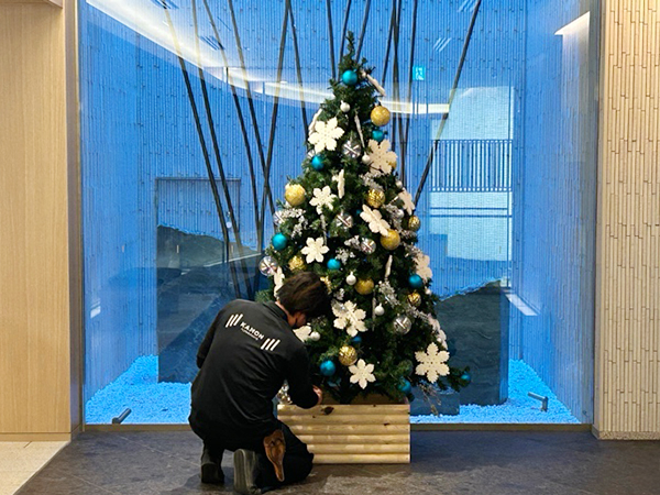 東京・渋谷にあります、外観からしておしゃれなマンションのエントランスへ、クリスマスツリーの設置を行いました。