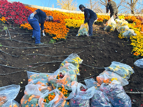 年4回、こうして都内在学の学生さんが描いた絵をベースに、平和と鎮魂を願った花壇管理をしています。