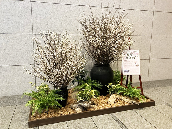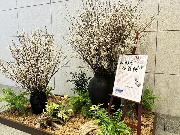 山形県が日本一の出荷量を誇る「啓翁桜ケイオウザクラ」の装飾をさせて頂きました。雪の中で育ち年末には開花が始まる啓翁桜。近年ではフラワーアレンジメントや贈り物としても需要が高まっているようです。山形の気候と長年の研究により培われた確かな技術により促成栽培された啓翁桜は3月まで、春を彩る切り枝として全国のお花屋さんにも出荷されています。春の訪れを一足先に。