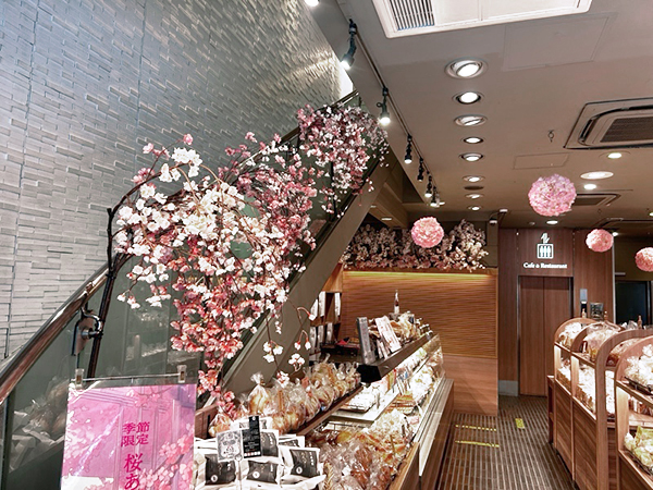 毎年になりますが、外の桜は本物の根がついた桜になります。そちらに造花を取り付けて常に満開の状態にしております。もう少し経つと本物の花も咲き葉も出てきます。